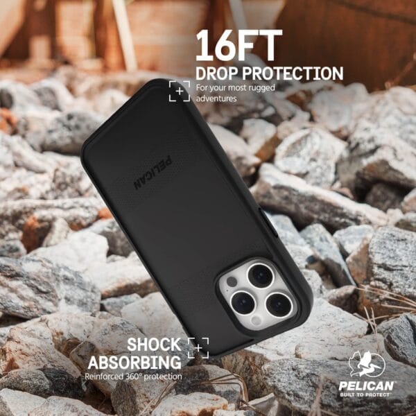 The Pelican Protector MagSafe case is built tough. An impact-resistant outer shell combined with a shock-absorbing rubber lining provides military-spec protection. Feel confident knowing your phone is secure with 16-foot drop protection while strong built-in magnets allow for easy MagSafe charging.